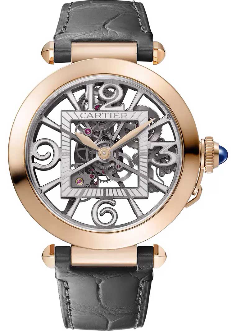 Desde 1985, Cartier propone el Pasha. Y hoy llega en versión skeleton, con caja de 41 mm en oro rosa. Así, se puede apreciar el esqueletado de los puentes en forma de números arábigos 3, 6, 9, 12 y el azul de la corona. Se trata en realidad de un protector de corona adornado con zafiros. El movimiento que acciona este Cartier Pasha está compuesto por 172 piezas, 28 de las cuales son rubíes. La correa con hebilla desplegable es de piel de aligátor negra, pero se puede elegir la gris oscura y alternar entre ambas a voluntad, ya que son intercambiables sin necesidad de acudir al pulsador.
