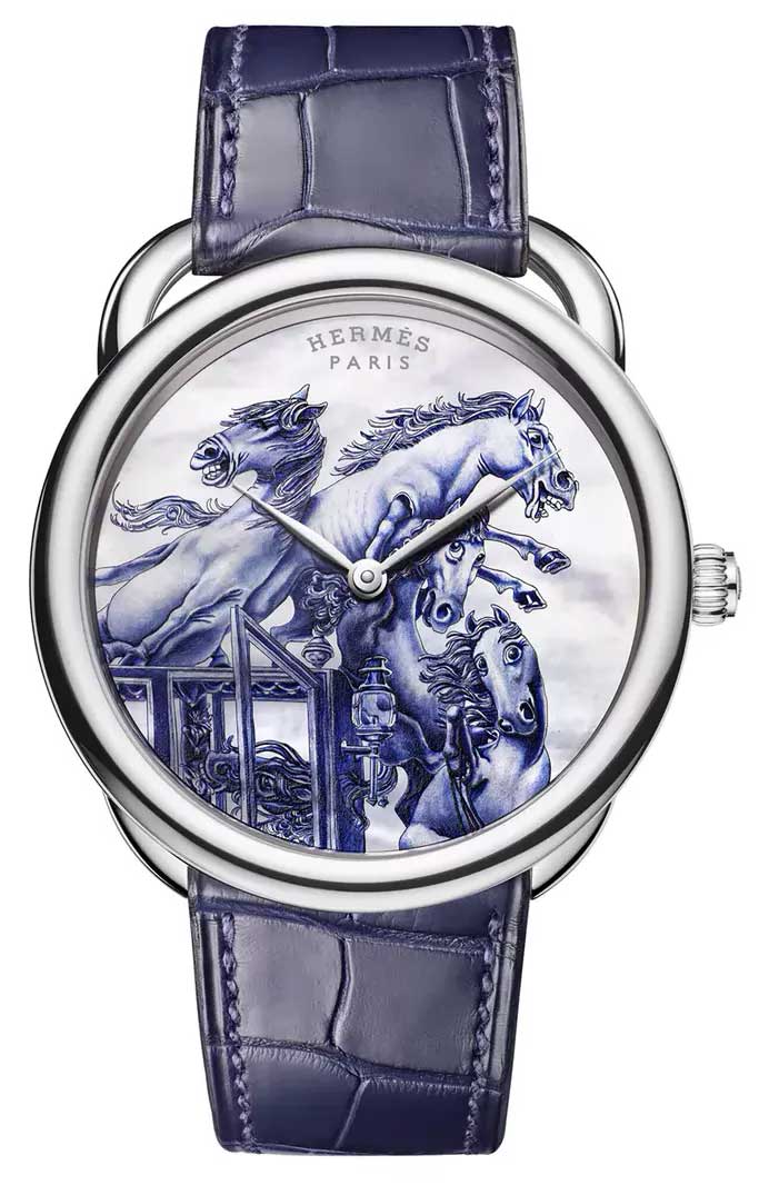 Cuando Francia y Dinamarca unen sus fuerzas y talentos, el resultado es uno de los relojes de lujo más vibrantes: esta pieza de oro blanco de 41 mm y belleza singular. La casa francesa Hermès ha confiado al ilustrador danés Claus Rye, famoso por sus dibujos de animales, la tarea de dibujar un caballo, animal emblemático de la gran H, en la esfera de este reloj. Ya había dibujado el motivo “Grand Carrosse Royal” para una de las famosas escuadras de la empresa.