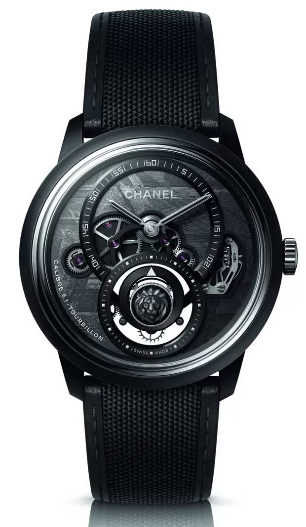 La esfera calada de este reloj negro se denomina “meteorito” porque se ha trabajado con extractos de un meteorito de 1906. Esto explica el nombre del nuevo reloj Chanel. También incluye la palabra “tourbillon”, ya que una jaula de tourbillon está presente a las 6 horas. Está engastada con una placa decorada con una cabeza de león, el signo astrológico de Gabrielle Chanel. Si la corona es de acero, la correa es de nylon negro, forrada de piel de becerro, con hebilla desplegable. Una mezcla de comodidad y ligereza.