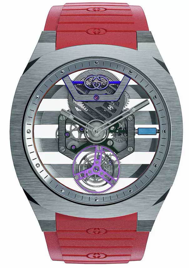 Así que aquí estás tú, en cierto sentido, en un espacio de tiempo fuera de lo común que te permitirá meditar sobre el giro del tourbillon. La caja de oro blanco de 40 mm está pulida, cepillada y arenada. Todo ello hace de este nuevo GUCCI 25H Skeleton Tourbillon un reloj excepcional.