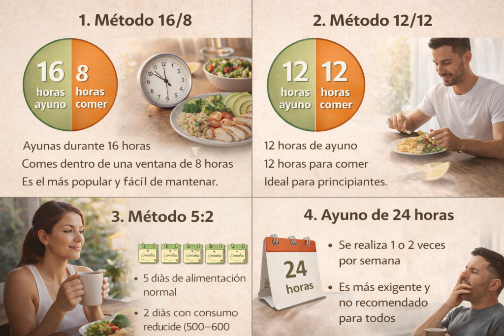 El ayuno intermitente es un patrón de alimentación que alterna períodos de ayuno (sin consumir calorías) con períodos de ingesta de alimentos. No restringe alimentos específicos, sino el tiempo en que los consumes.