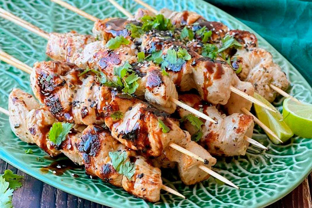 Ensartar los tacos marinados en palos de madera para brochetas. Engrasar una parrilla o sartén y asar las brochetas hasta que queden doradas por ambos lados.