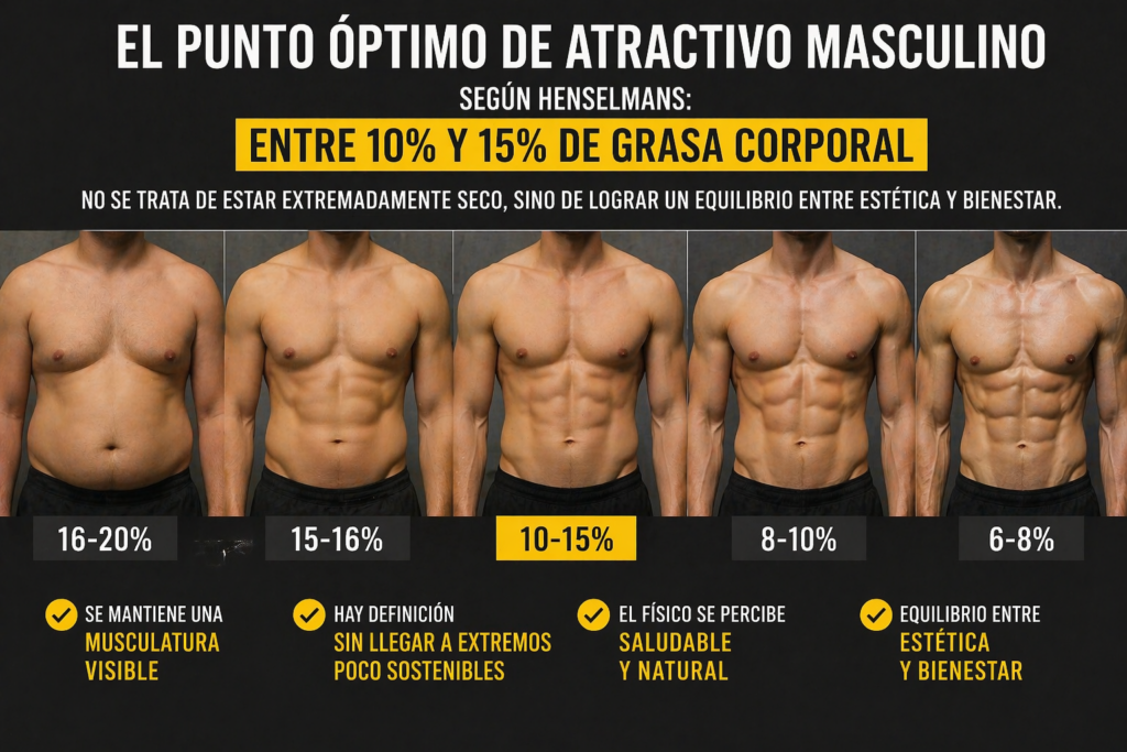 Henselmans señala que el punto óptimo de atractivo masculino se sitúa aproximadamente entre un 10% y un 15% de grasa corporal.