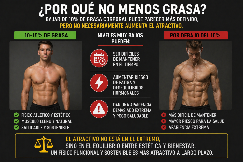 El atractivo masculino no está en los extremos, sino en el equilibrio. Un porcentaje de grasa entre el 10% y el 15% permite mostrar un físico definido, saludable y sostenible en el tiempo.
