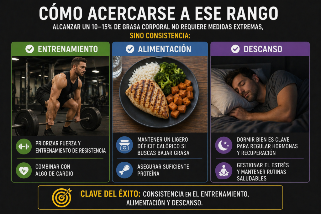 Alcanzar un 10–15% de grasa corporal no requiere medidas extremas, sino consistencia: