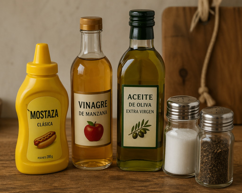 - Prepara la vinagreta mezclando mostaza, vinagre, aceite, sal y pimienta.
