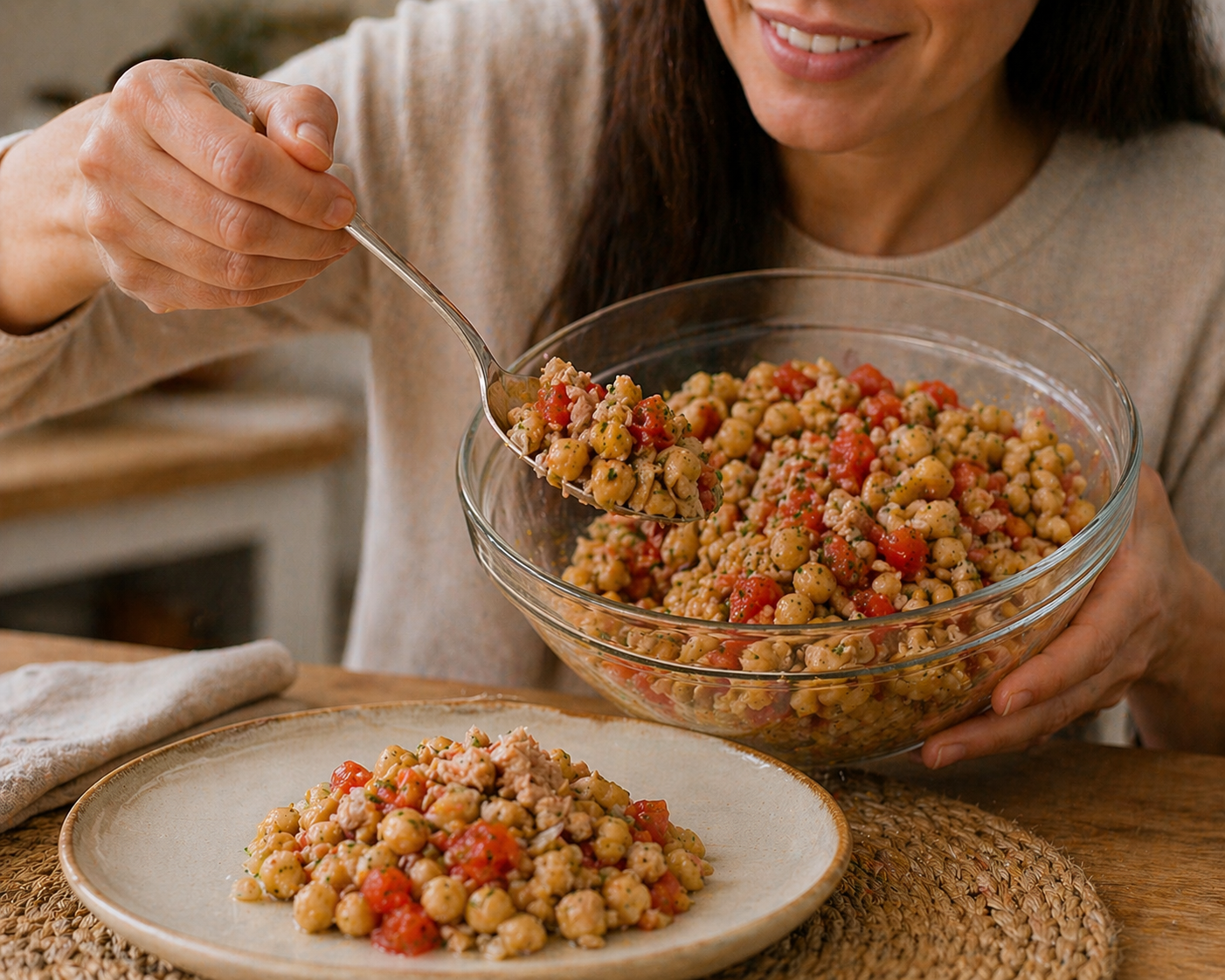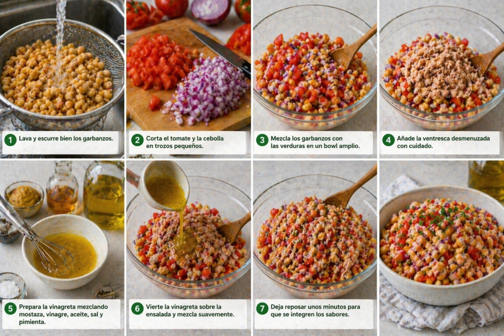 Cuando buscas una comida completa, saludable y fácil de preparar, esta ensalada de garbanzos con ventresca es una opción que destaca. Combina proteínas de alta calidad, grasas saludables y una base vegetal rica en fibra, todo con un sabor intenso gracias a la vinagreta de mostaza.