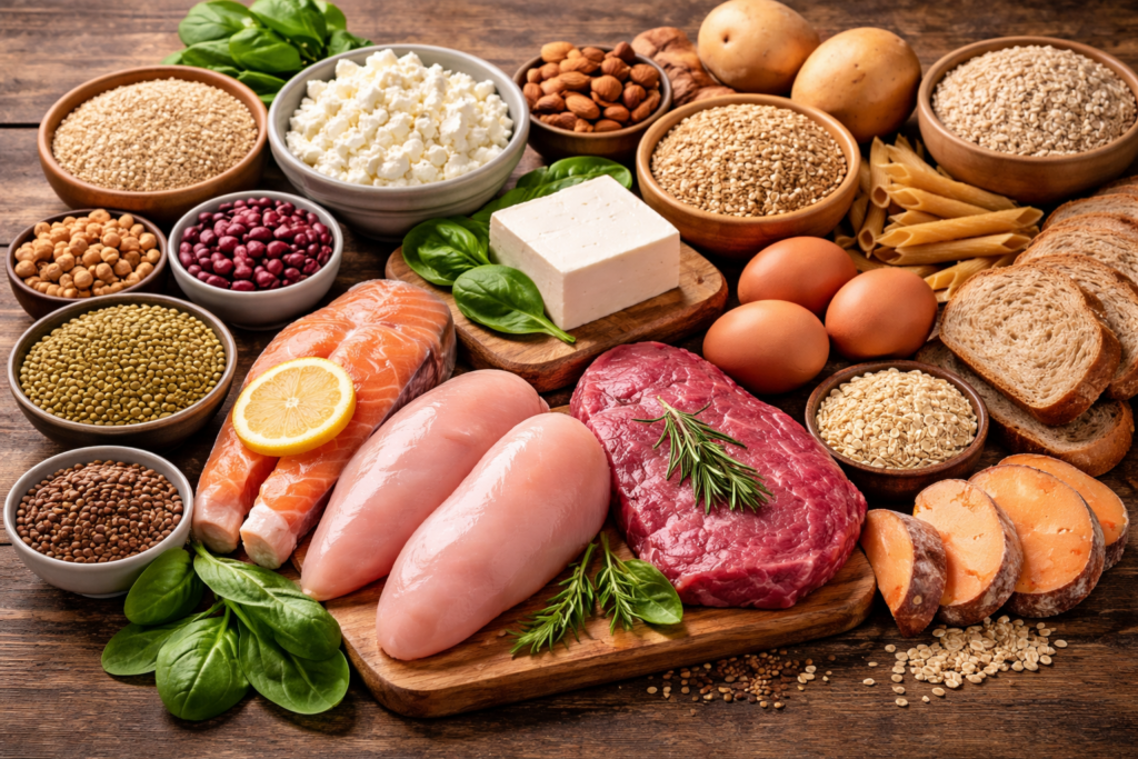 - Proteínas: carne, pescado, huevos, legumbres