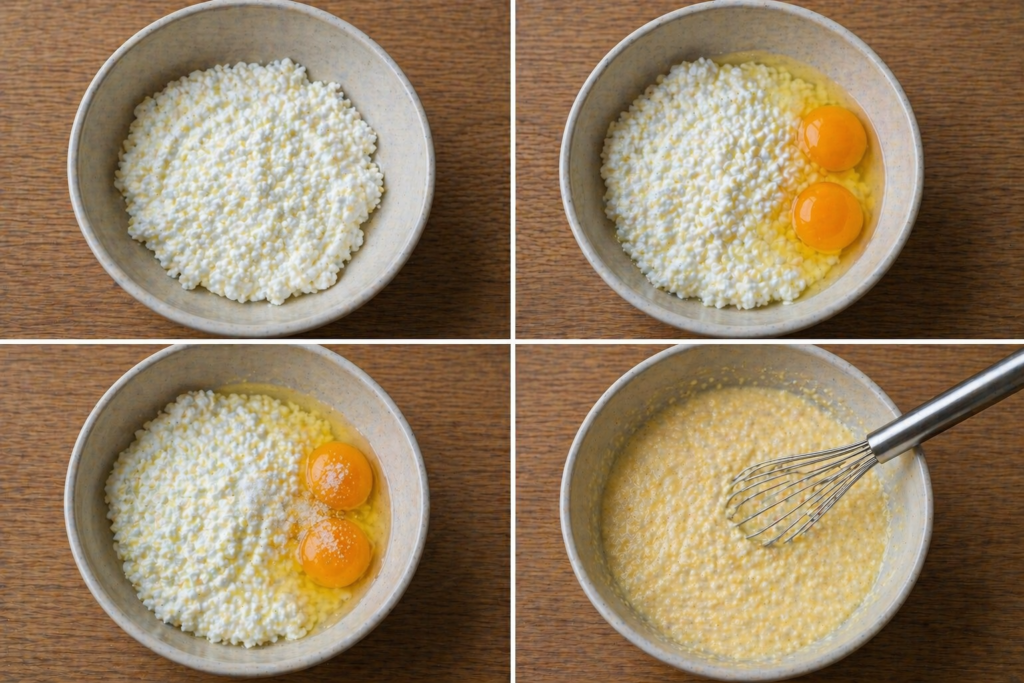 En un bol, añade el queso cottage, los huevos y la sal. Mezcla bien hasta obtener una base homogénea.