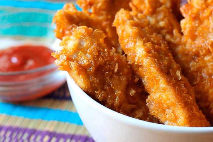 - A continuación untamos cada trozo de pollo con la mezcla de condimentos y lo cubrimos con el cereal.